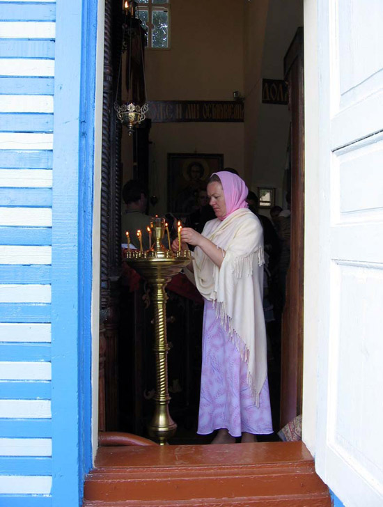 Вечереет. Будний день. В Лучегорском храме тихо и безлюдно. Перед иконой Скоропослушницы и Распятием горят зажженные лампады. Иногда кто-нибудь забежит свечу перед образом поставить, помолившись про себя, или приобрести что-то в свечной лавке. Перед большой храмовой иконой Скоропослушницы три прихожанки вычитывают акафист. По храму расходятся тихие слова молитвы, произносимые на распев. Женщины обращаются с надеждой, что хваления и просьбы дойдут до небесного адресата.