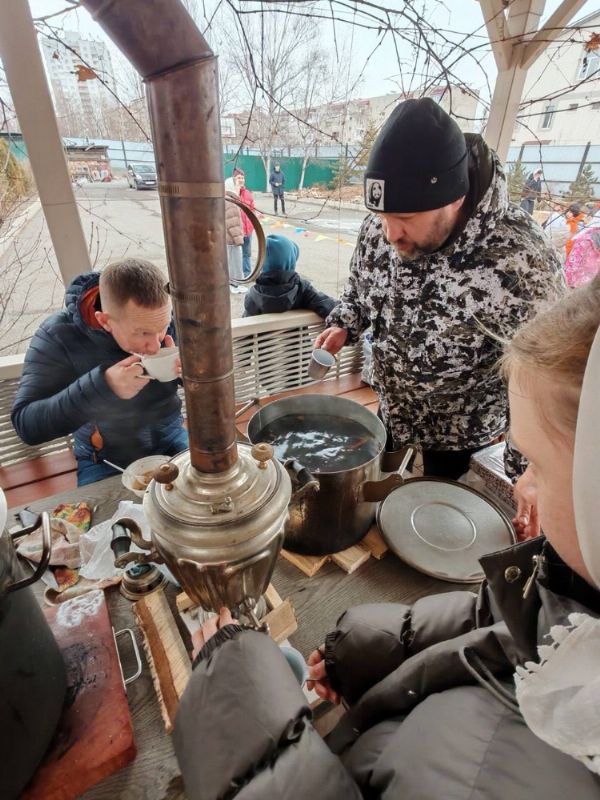 Прихожане приготовили трапезу с настоящим русским самоваром, блинами, сладостями и ухой из семги и форели. Различные конкурсы и забавы и русские народные песни порадовали детей. Вдоволь наигравшись и получив заслуженные призы, ребята приступили к трапезе и делились своими впечатлениями. Взрослые же, понимая серьёзность этого дня, настроились на Великий пост.