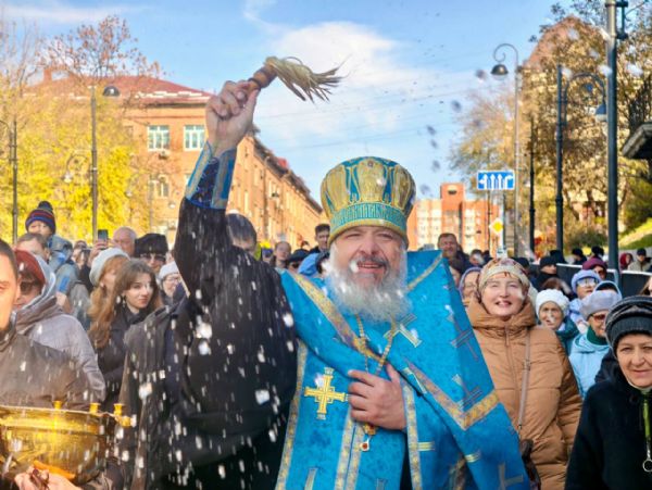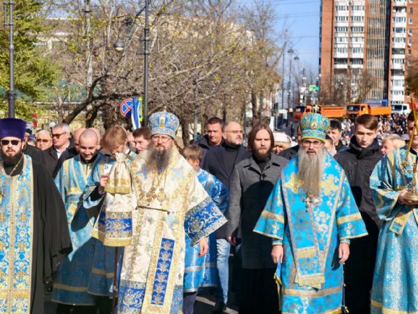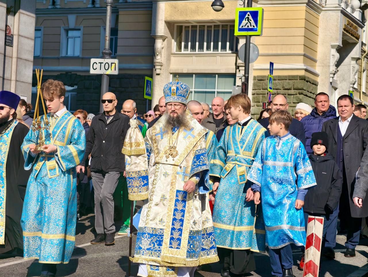 Колокольный звон, святые иконы в руках моряков-тихоокеанцев, стройные ряды духовенства в голубых облачениях, с крестами и хоругвями, за которыми разливается широкая река православного народа с тропарями Божией Матери на устах — так торжественно и духоподъёмно выглядел сегодня Океанский проспект.