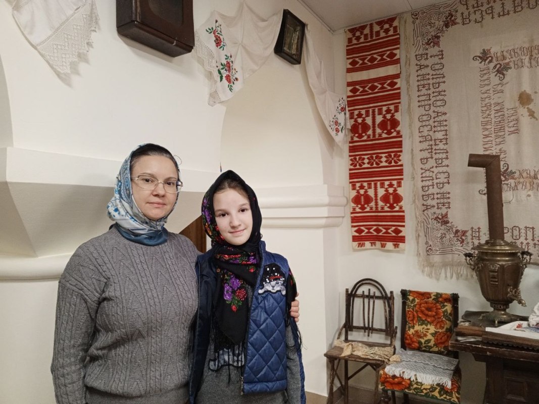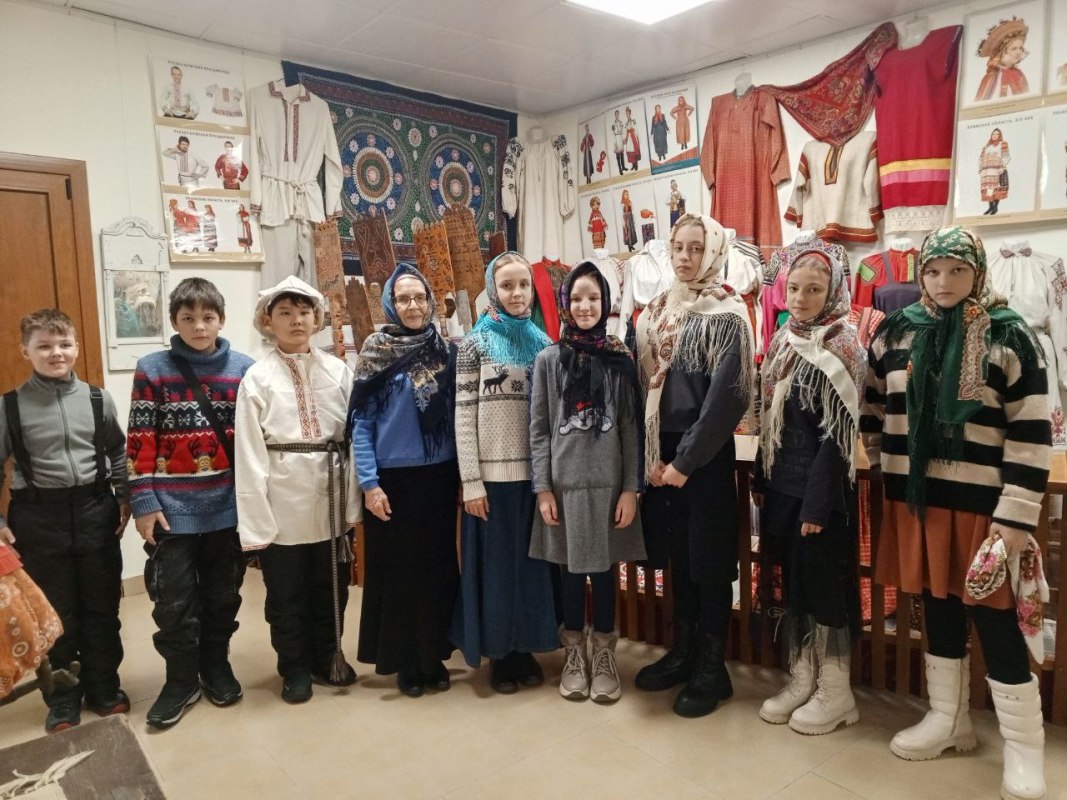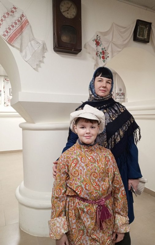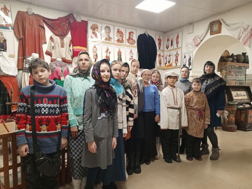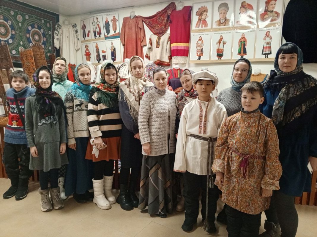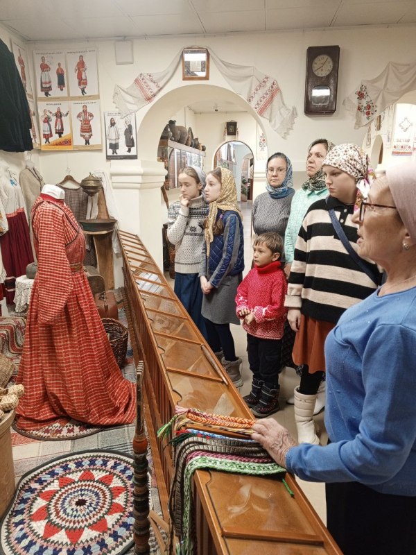 Затем Ирина Геннадьевна Бердникова, руководитель ОРОиК, провела для детей и взрослых экскурсию по Музею русской народной культуры. Современные взрослые, девочки и мальчики узнали об особенностях и технологии изготовления традиционной одежды и даже смогли примерить её, почувствовать родство с предками-крестьянами.