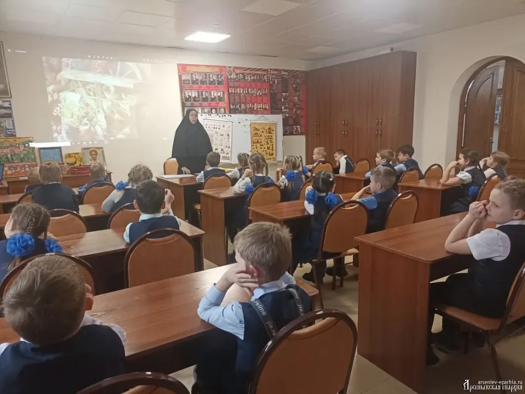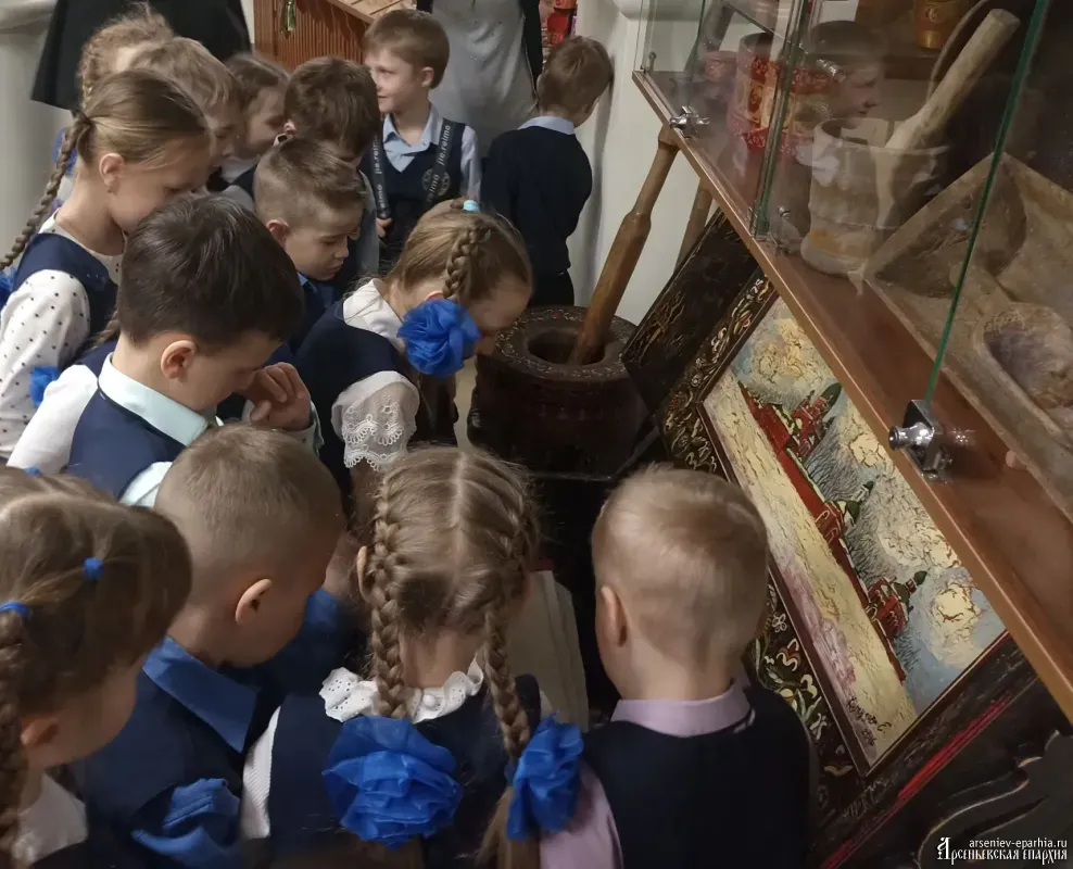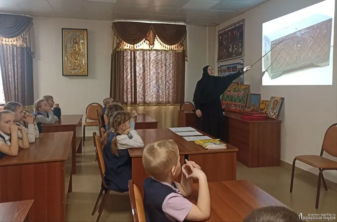 В Духовно-просветительском центре г. Арсеньева прошло необычное занятие в рамках уроков нравственности «Зёрнышки для души». Вместе с инокиней Марией (Воробьёвой) учащиеся 1 класса школы №8 отправились в путешествие в прошлое, открыв крышку старинного сундука.