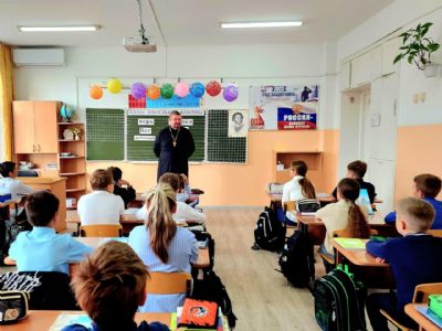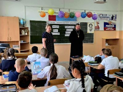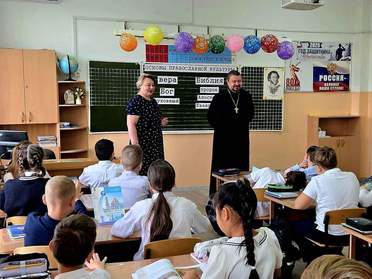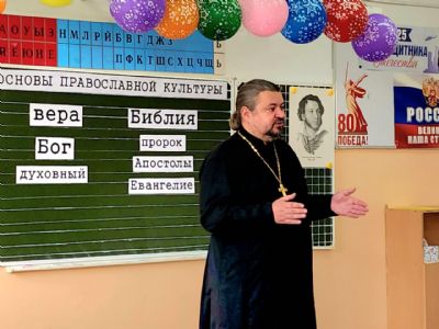 Иерей Виталий Шаркеев, руководитель миссионерского отдела Находкинской епархии, провел урок по модулю «Основы православной культуры» для учащихся 4-го «Б» класса школы № 14 на тему «Библейская история».