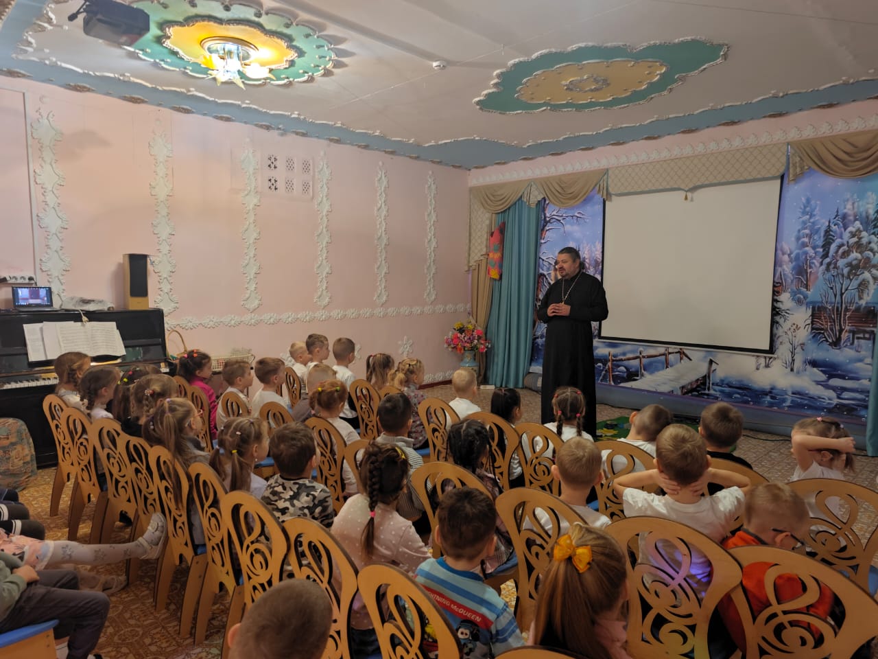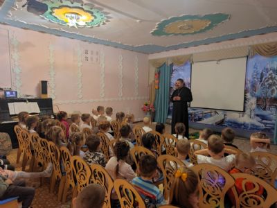 Иерей Виталий Шаркеев проводит беседы с дошкольниками.