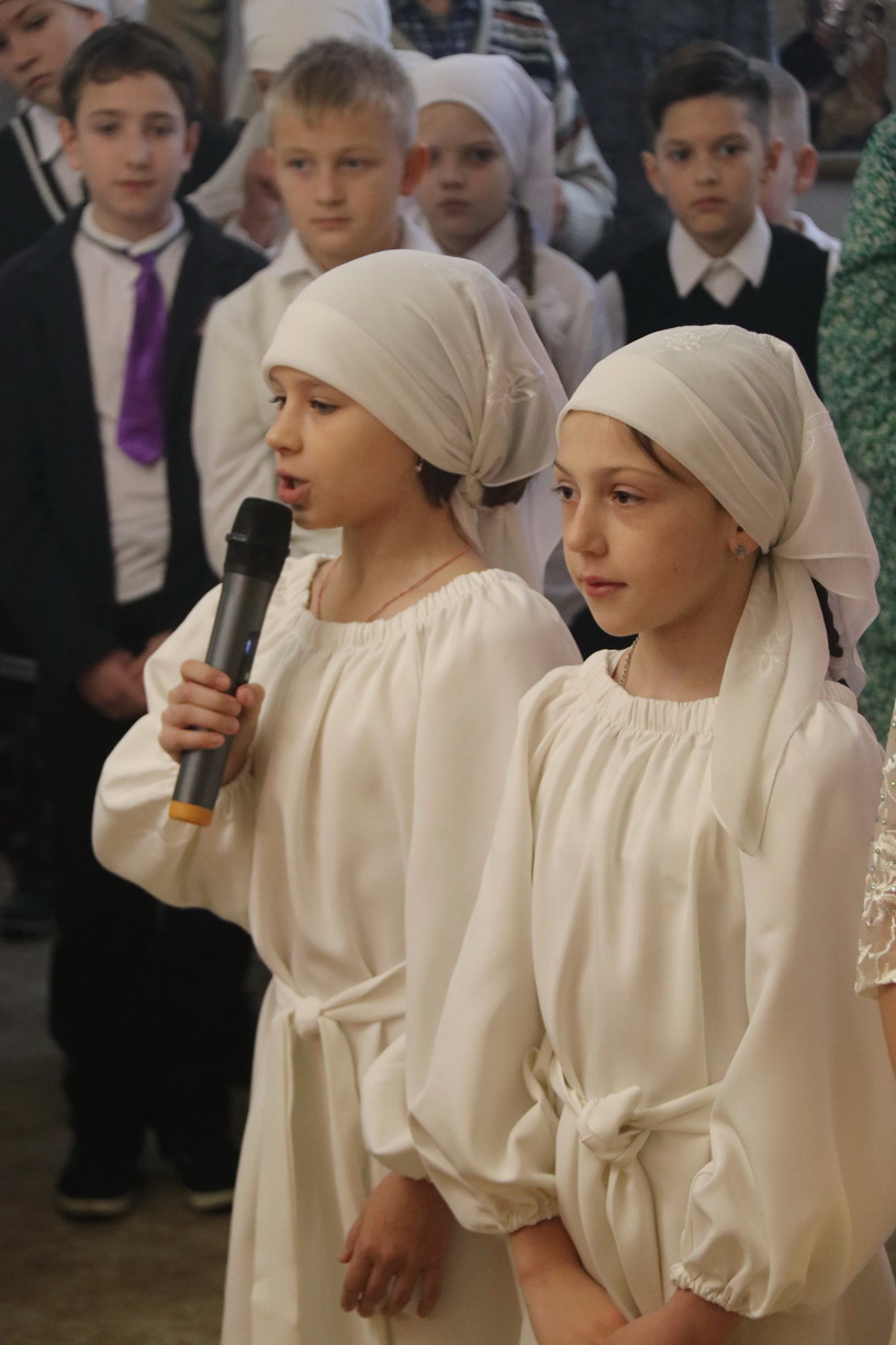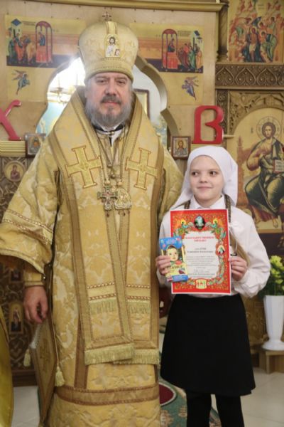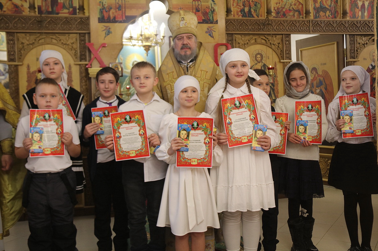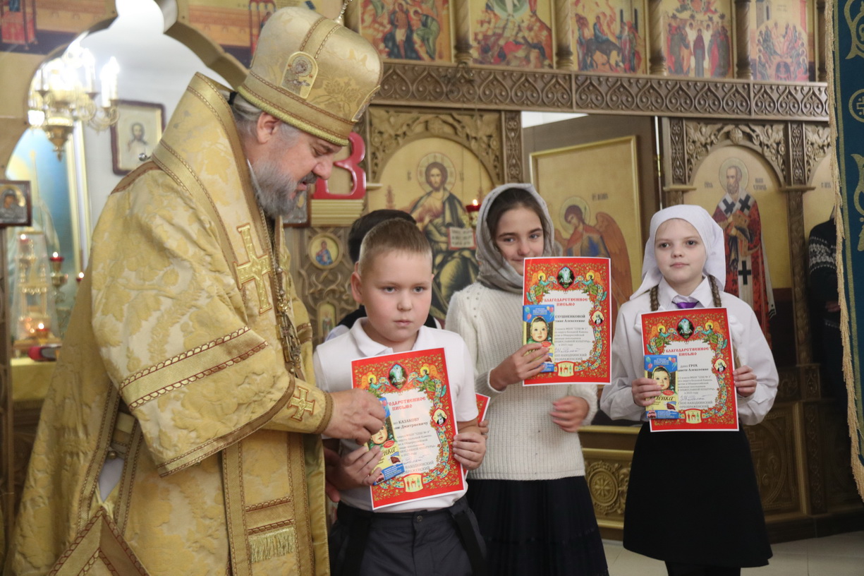 Поздравление в стихах для архипастыря подготовили воспитанники Воскресной школы Никольского храма. Так же, учащиеся Воскресной школы, участники Общероссийской олимпиады школьников "Основы православной культуры", были награждены архиерейскими благодарственными письмами.