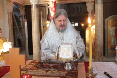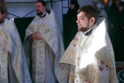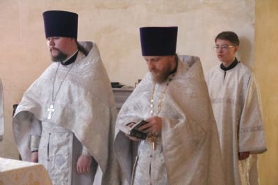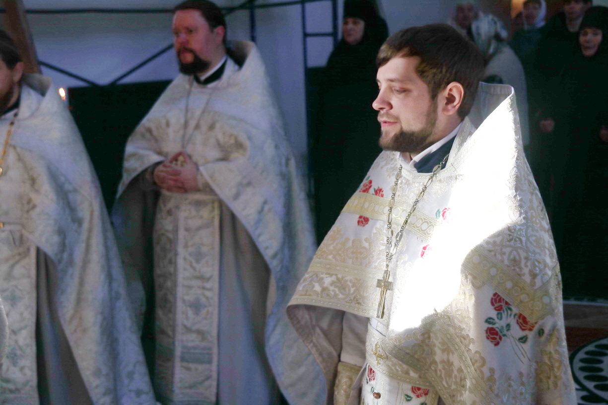 Его Преосвященству сослужили: иерей Иоанн Капитанюк, настоятель храма Рождества Христова г. Находки; иерей Андрей Калнин, ключарь Казанского собора г. Находки; иерей Андрей Попов.