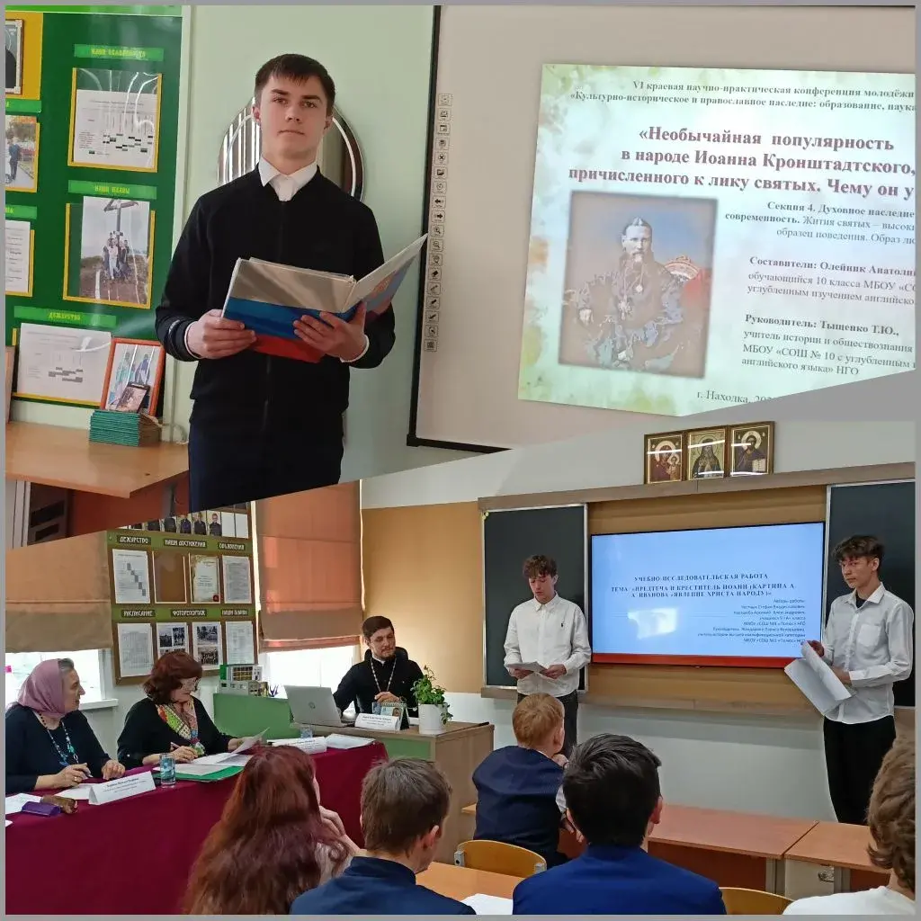 В секции No 4 «Духовное наследие великой Руси и современность» Анатолий Олейник, ученик 10 класса «СОШ N10 с углубленным изучением английского языка» представил свою работу по теме «Необычайная популярность народе Иоанна Кронштадтского, причисленного к лику святых Чему он учил?» Его работа заняла 3 место.