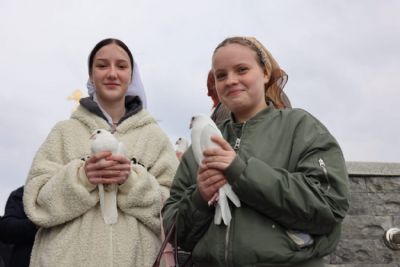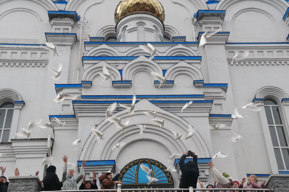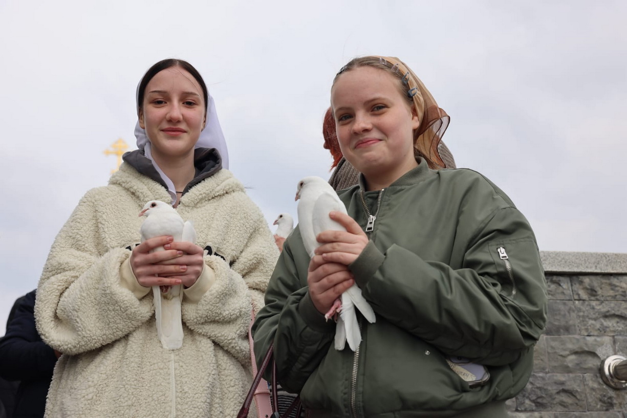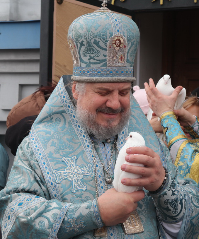 По окончании богослужения Преосвященный Николай, с паперти верхнего храма, выпустил в небо над Кафедральным собором белых голубей.