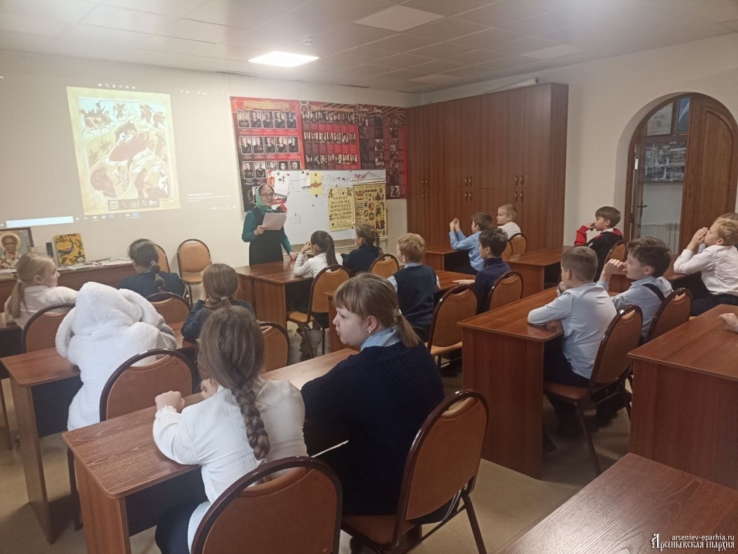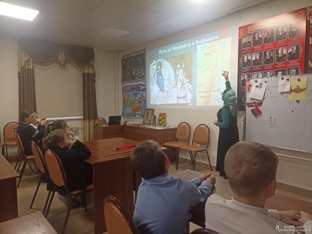 23 декабря 2025 года в Духовно-просветительском центре г. Арсеньева для учащихся начальных классов Лицея №9 г. было проведено занятие о Рождестве Христовом в рамках цикла бесед о русских православных традициях.