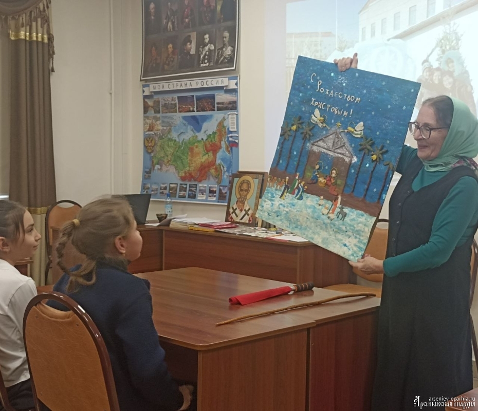 Провела беседу Ирина Геннадьевна Бердникова, руководитель Отдела религиозного образования и катехизации Арсеньевской епархии. Ирина Геннадьевна побеседовала с детьми о празднике, напомнив его историю. Ученики узнали, как называется город, в котором родился Богомладенец Христос, почему Он лежит в яслях и для чего Бог пришёл в этот мир. Также поговорили о традициях, связанных с этим великим православным торжеством и о святых святочных днях.