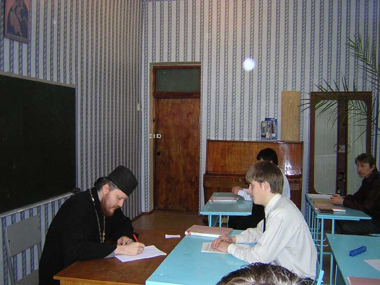 Нынешний экзамен состоялся в первом классе, где обучается 9 человек. Проводил «испытание» - игумен Феофан (Зиборов), выпускник Московской Духовной Семинарии и в прошлом ведущий солист семинарского хора под управлением архимандрита Матфея.