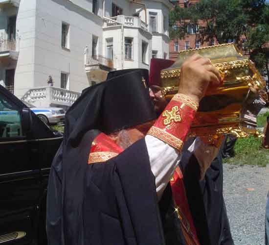 Владивосток. В празднике по случаю принесения православных святынь участвует все православное духовенство Приморья. Они сопровождают святыню во время ее пребывания в краевом центре. Сегодня ковчег с мощами святых Елисаветы и Варвары в торжественном кортеже перенесен из Марфо-Мариинской обители в храм Успения Божией Матери, что на улице Светланской, где до 1937 года стоял Кафедральный собор города, разрушенный в годы гонений на церковь.