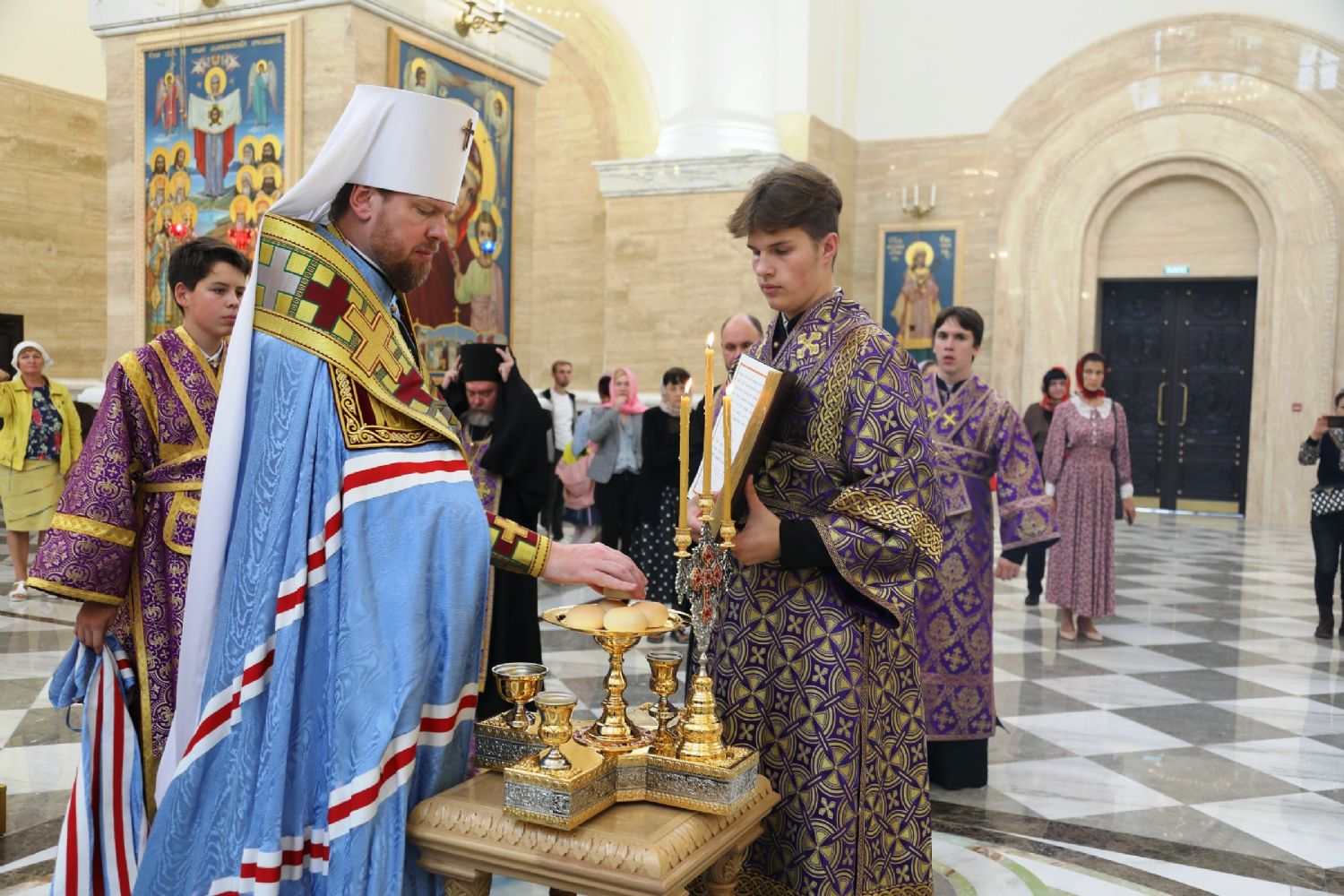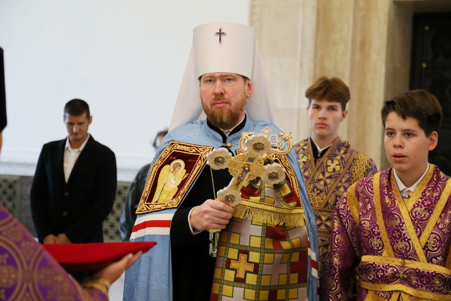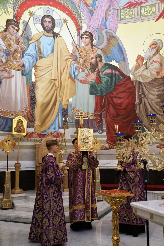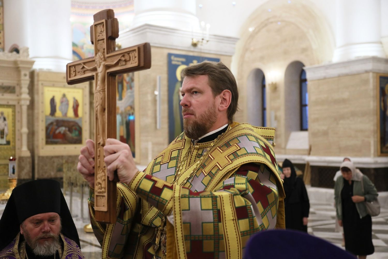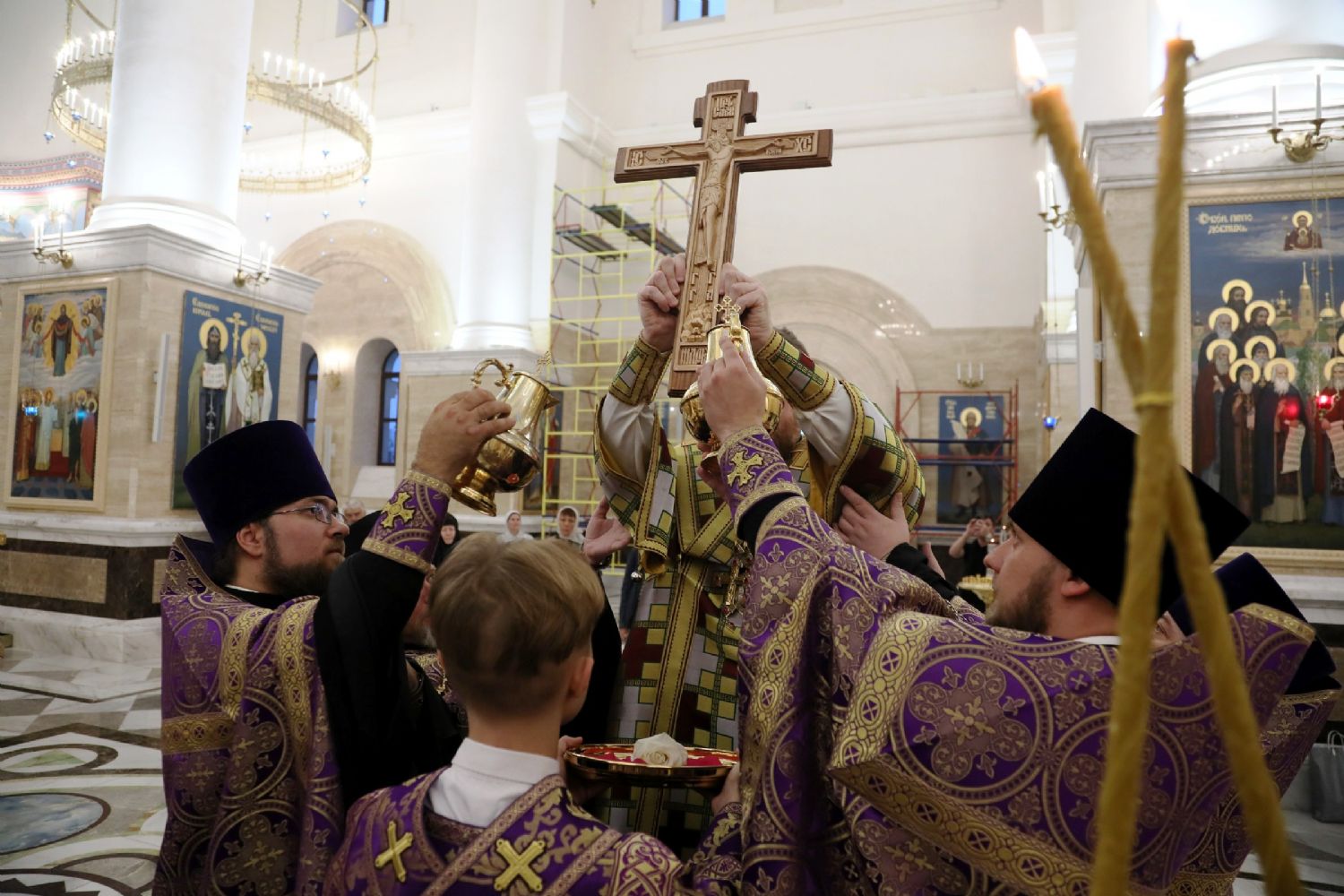 На великом славословии митрополит Владимир совершил чин Воздвижения Честного и Животворящего Креста Господня. После троекратного каждения престола, на который перед началом богослужения был возложен украшенный крест, с пением Трисвятого крест был вынесен из алтаря для совершения древнего чина Воздвижения. С сугубыми прошениями пять раз крест был вознесен на все стороны света под пение стократного «Господи, помилуй» и с возливанием на него благовоний.