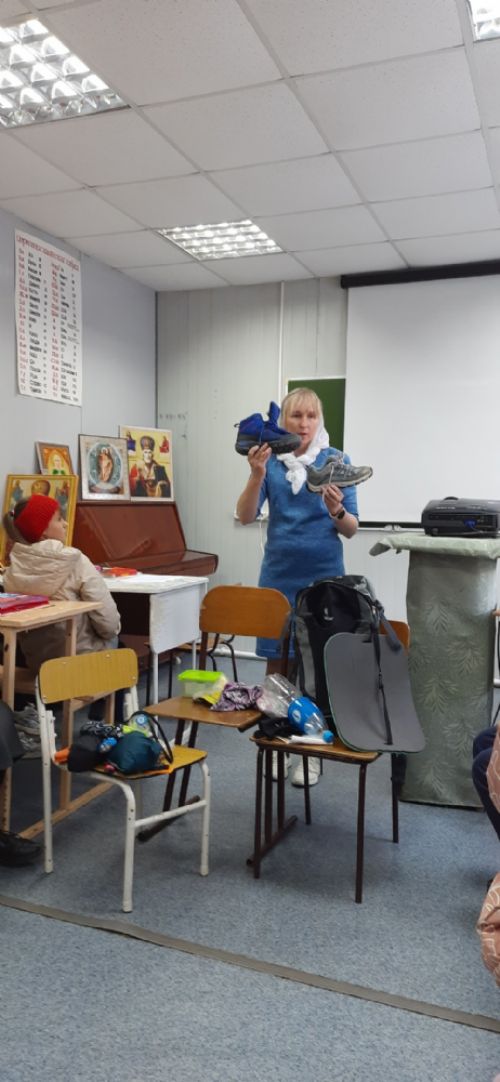 Прихожанка Вознесенского храма Ирина Александровна Моляренко, учитель физкультуры и ОБЖ в общеобразовательной школе, показала презентацию по теме, а потом попросила детей разобрать принесенный рюкзак с вещами и предметами, которые необходимы для однодневного похода. Ребята с удовольствием рассматривали содержимое рюкзака, объясняя, для чего и зачем нужно в походе то или иное.