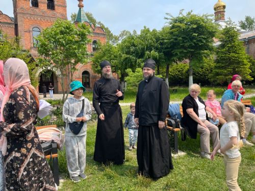 Приехав к окончанию Божественной литургии в храме, паломники, по благословению настоятеля монастыря игумена Климента, развернули на поляне перед храмом стол для общей трапезы. За обедом несколько поколений учащихся воскресной школы с радостью вспоминали поездки в монастырь в предыдущие годы, православный лагерь и многое другое.