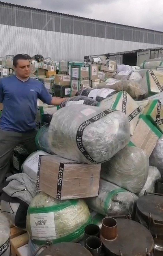На фото: прифронтовой гуманитарный склад, на котором разгружают помощь, привезённую группой «Своих не бросаем». Отдельно демонстрируют коробки с качественными медицинскими жгутами, которые выглядят немного непривычно.
