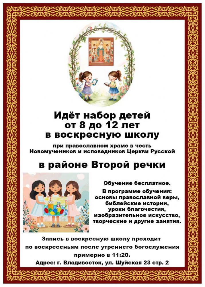 Иерей Владимир Ковальчук, клирик храма, приглашает всех детей в воскресную школу. Записать ребёнка можно в любое воскресенье после утреннего богослужения.