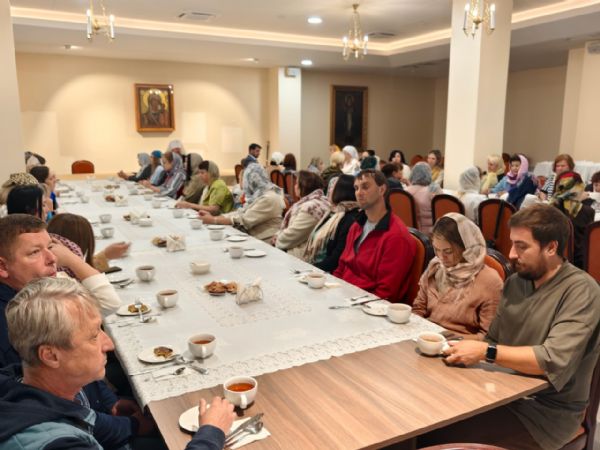 Беседа продолжилась в трапезной, за столами с чаем и пирогом. Владыка рассказал о своём жизненном и духовном пути, а через него — о буднях и праздниках Церкви, о служении Христовой истине, о верности Богу и любви к людям.
