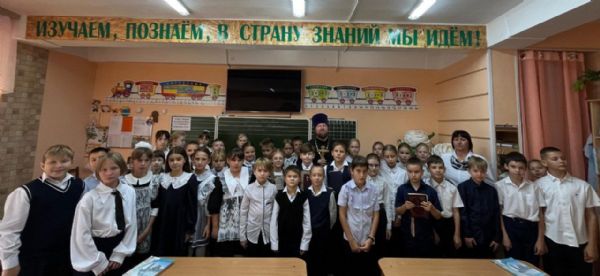 1 октября в СОШ № 8 г. Спасска-Дальнего по приглашению руководства школы иерей Владимир Коротких, настоятель храма Преображения Господня, встретился с учениками двух четвёртых классов. Всего на встрече присутствовало около 40 ребят.