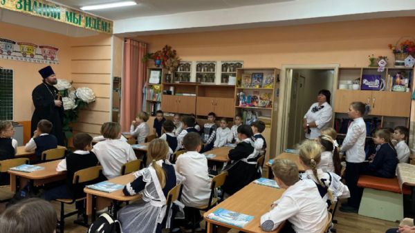 Отец Владимир уже не первый раз выступает перед детьми в данном учебном заведении в рамках школьного курса «Основы православной культуры». Батюшка начал урок словами из Евангелия от Иоанна: «Исследуйте Писания, ибо вы думаете чрез них иметь жизнь вечную; а они свидетельствуют о Мне» (Ин. 5, 39). Ученики ознакомились с принесёнными из храма Библией, Псалтирью и Четвероевангелием. Отец Владимир рассказал не только о Священном Писании Ветхого и Нового Завета (структуре, месте, времени написания и другой интересной информации), но и о Святой Троице, Господе Иисусе Христе, Крестной смерти и Воскресении, евангельских заповедях и спасении людей. В конце встречи священник ответил на вопросы ребят и угостил их просфорами из храмовой пекарни.