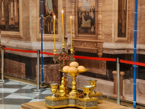 После литии владыка совершил благословение и освящение пяти хлебов, вина и елея, а в начале канона совершил помазание молящихся освященным елеем.