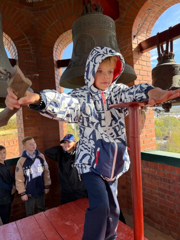 После экскурсии батюшка пригласил школьников на совместное чаепитие. В завершение мероприятия все желающие поднялись на колокольню и попробовали себя в роли звонарей.
