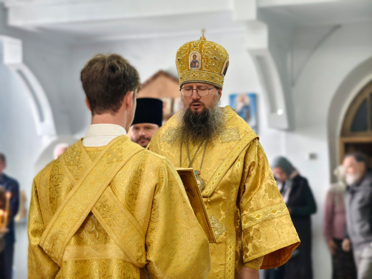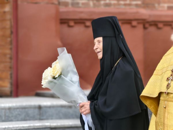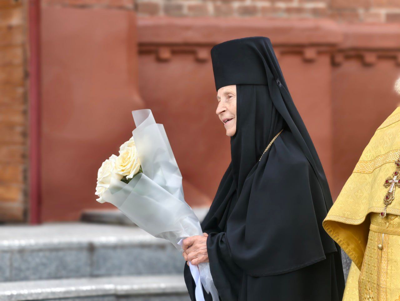На входе в храм настоятельница обители игумения Варвара (Волгина) поблагодарила владыку Павла за архипастырский визит и преподнесла ему букет белых роз.