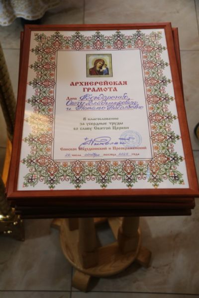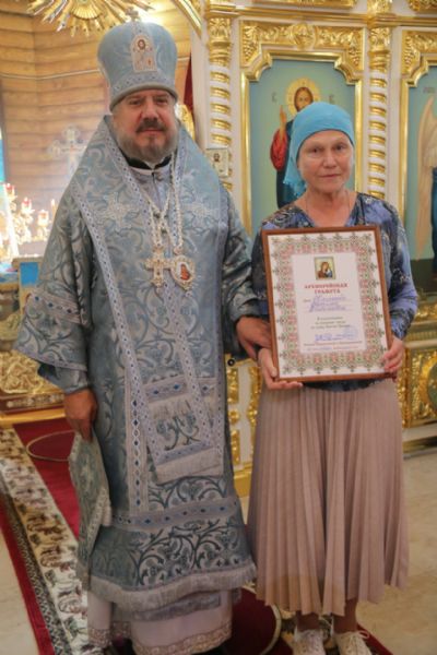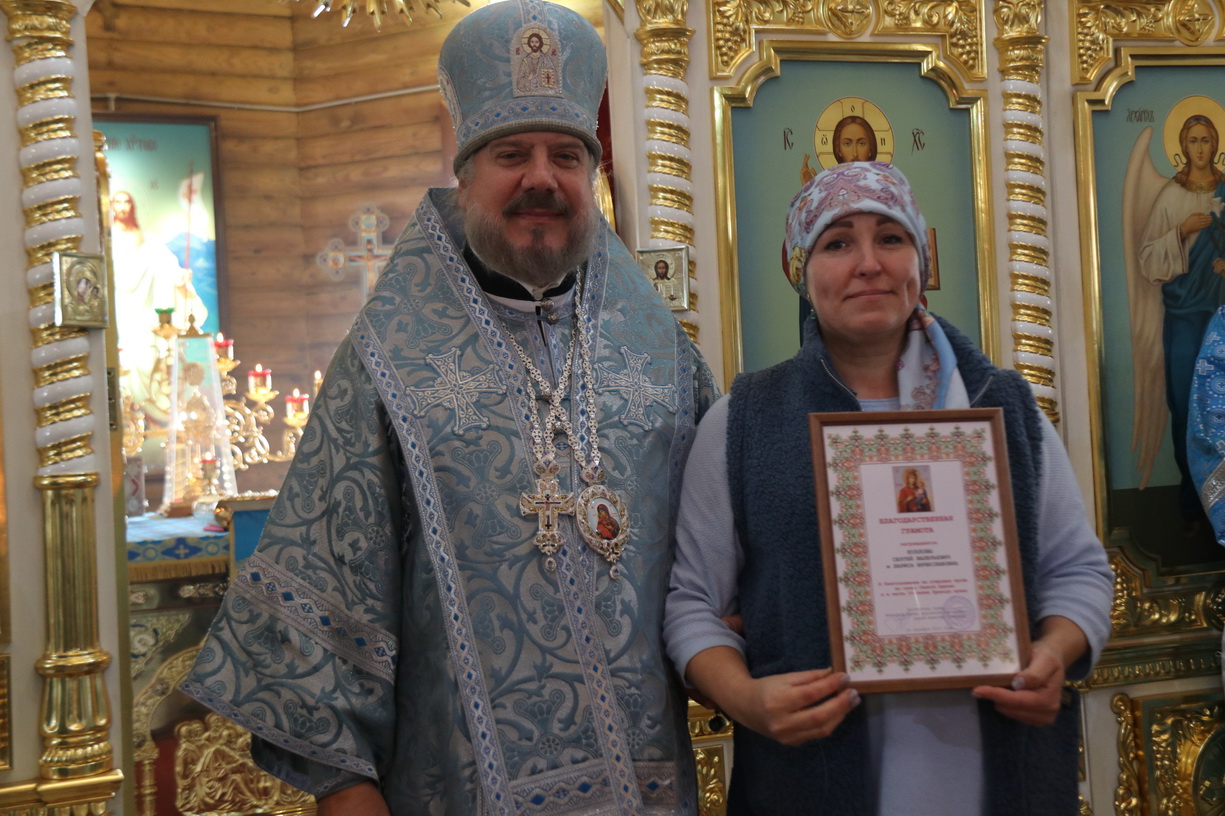 В благословение за усердные труды, и к 20-ти летию образованию прихода Иверской иконы Божией Матери, Владыка вручил Архиерейские и Благодарственные грамоты прихожанам и сотрудникам, которые многие годы трудились и участвовали в благоустройстве и становлении Свято-Иверского храма пгт. Смоляниново.Также всех присутствуюших, стихами и песнями, с престольным праздником храма подравили воспитанники Вокресной школы.