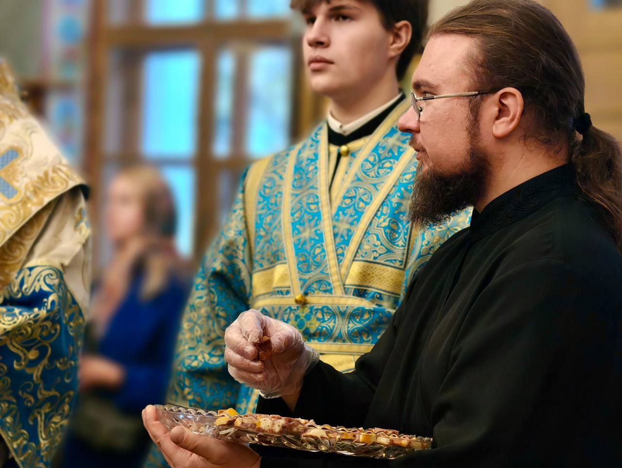 Глава митрополии совершил освящение пяти хлебов, вина и елея, а затем помазал прихожан освящённым маслом.