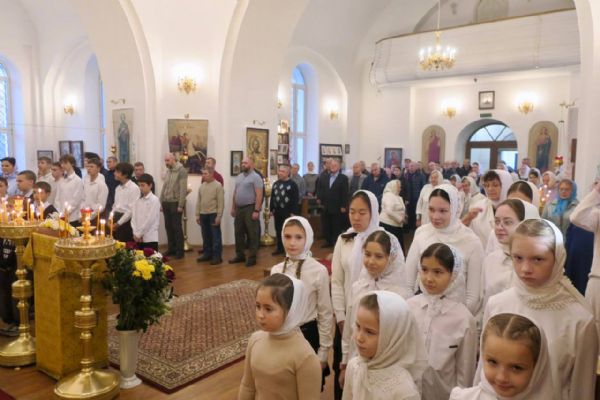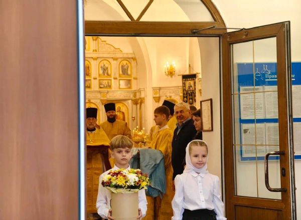 На входе в храм архипастыря встретили дети и преподнесли букет цветов. Вознести свои молитвы пришли около 60 верующих.