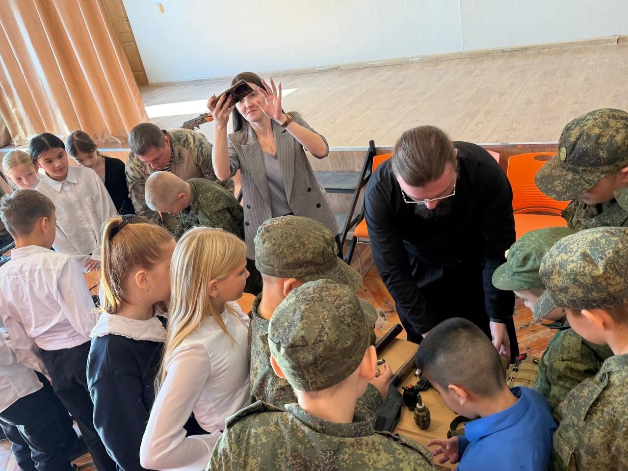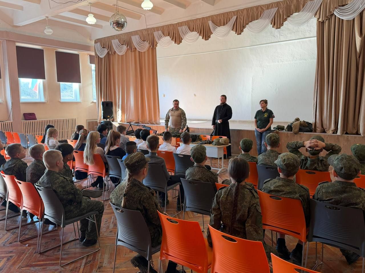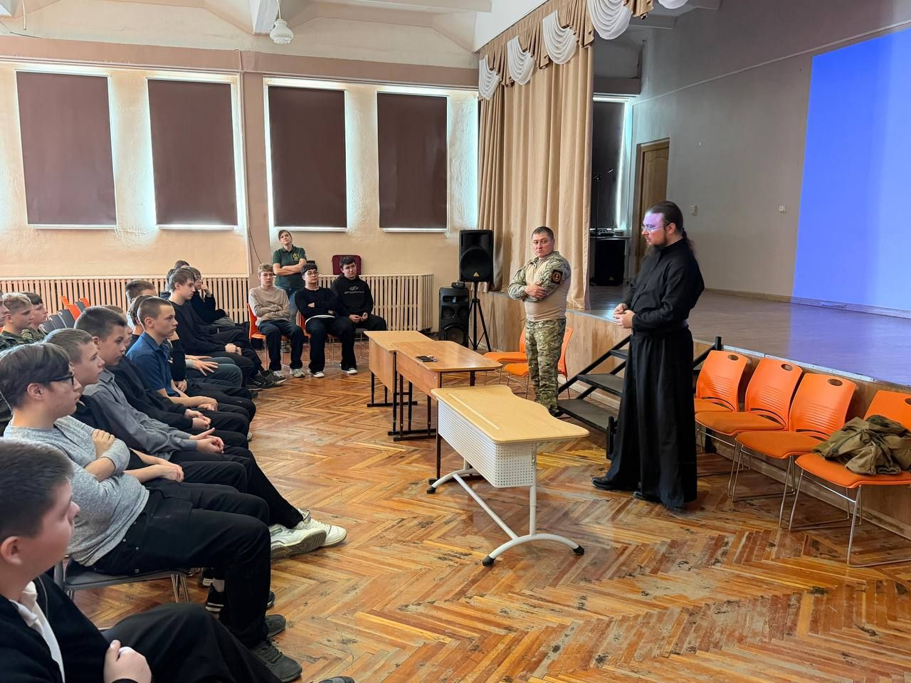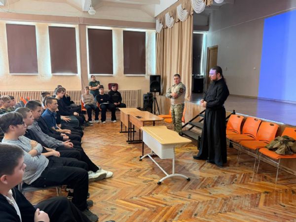 С учащимися 9-ых классов поговорили на более серьезные темы. Гости рассказали детям реальные фронтовые истории, показали видео с эвакуацией раненных бойцов. Особое внимание уделили теме веры на войне. Инок Дионисий поделился своим опытом общения с военнослужащими, а также подчеркнул важность единства солдат и духовенства на линии фронта.