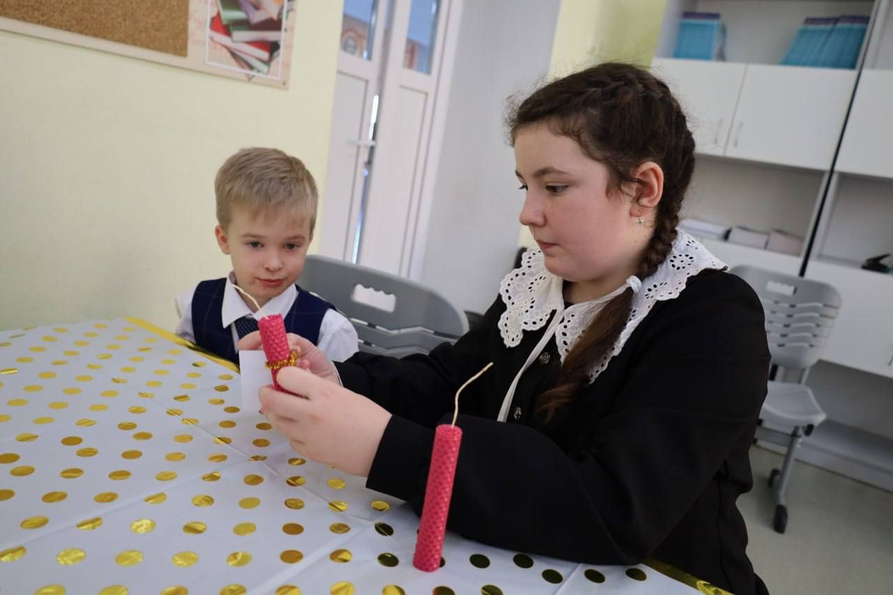 Отец Александр объяснил ребятам, кто такие святые, и рассказал краткое житие Николая Угодника. После ребята прочитали заготовленные стихи, исполнили песни, поиграли в игры «Свет добрых дел» и «Сундук доброты», а также поучаствовали в викторине по мотивам жития свт. Николая Чудотворца. Затем школьники под руководством взрослых сделали свечи, которые потом подарили родителям и близким.