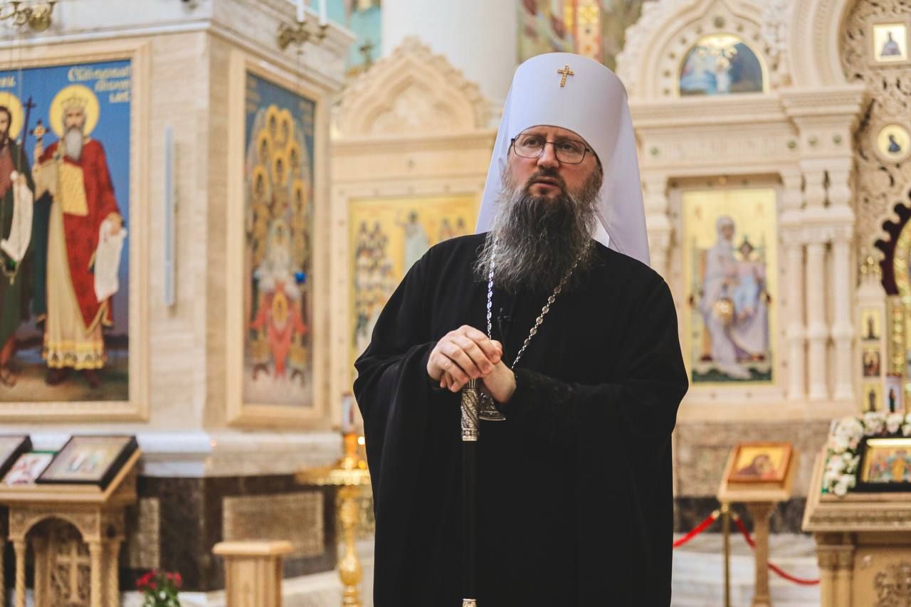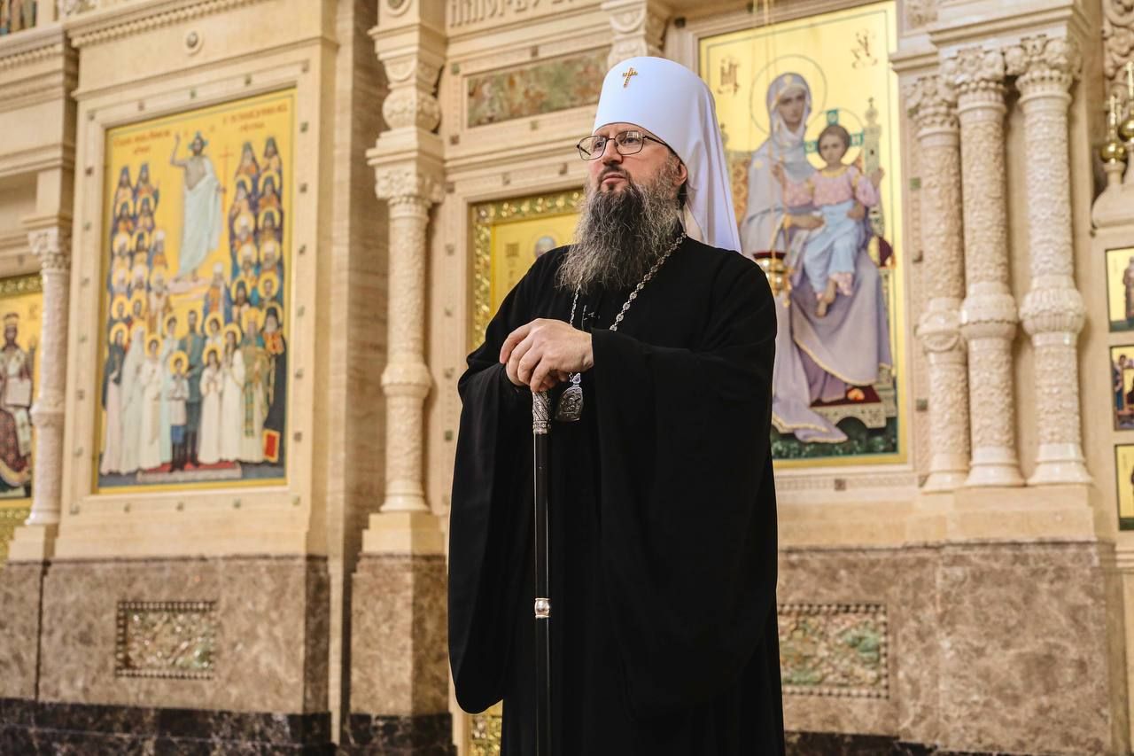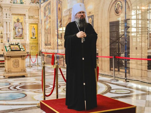 Затем все присутствующие спустились в стилобантную часть здания. Там правящий архиерей рассказал о некоторых экспонатах Музея Приморской митрополии и поделился краткой историей строительства кафедрального собора.