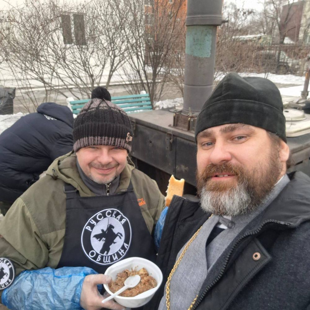 Гости праздника согревались горячим чаем из самовара и кашей, приготовленной на полевой кухне поваром Сергеем из «Русской общины».