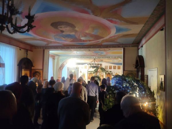 К Рождеству Христову храм был нарядно украшен: в центре установлен вертеп, елка сверкала тысячами огоньков, а Царские врата были обрамлены гирляндами из еловых ветвей.