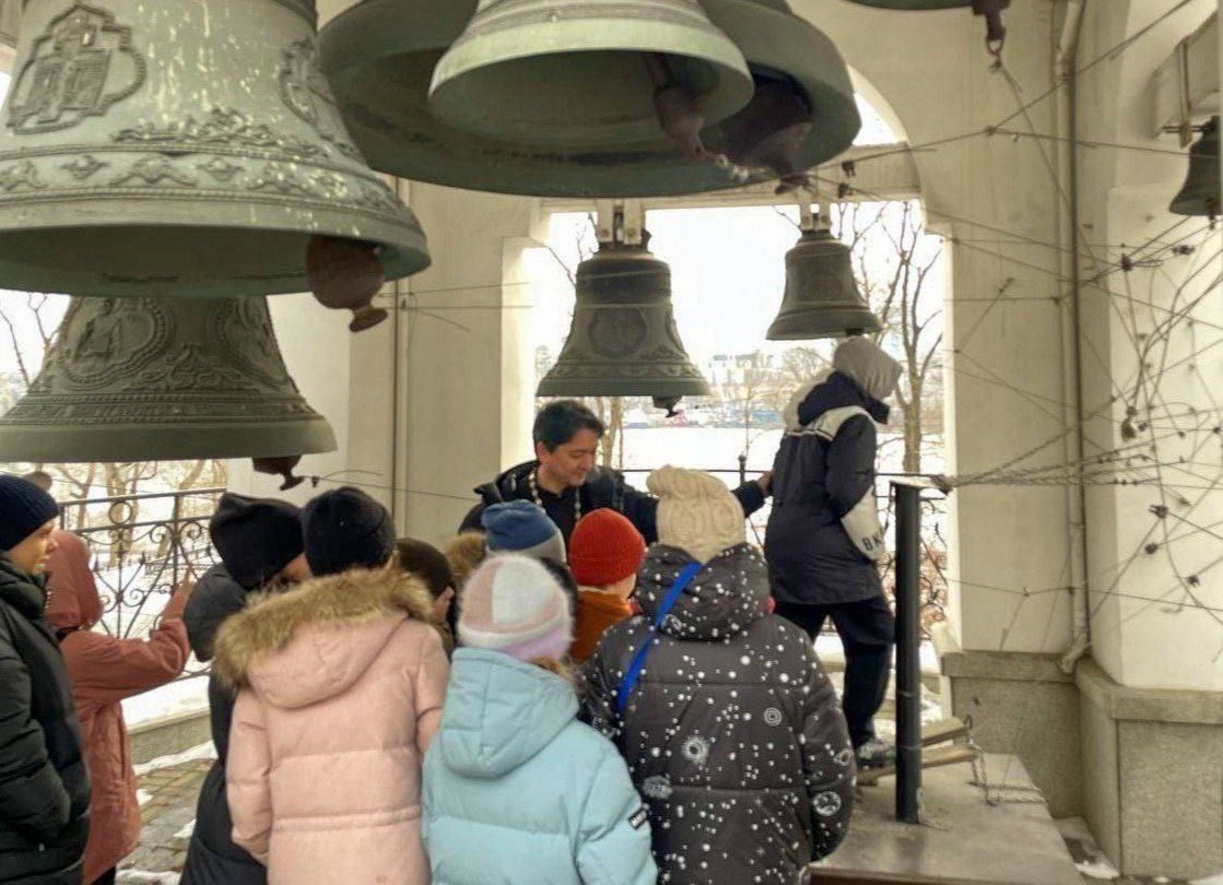Экскурсия продолжилась на территории храма. У информационного стенда Ольга Николаевна познакомила школьников с историей Успенского храма и его прихода. Дети также побывали на звоннице храма. По благословению отца Андрея каждый желающий смог попробовать себя в роли звонаря.