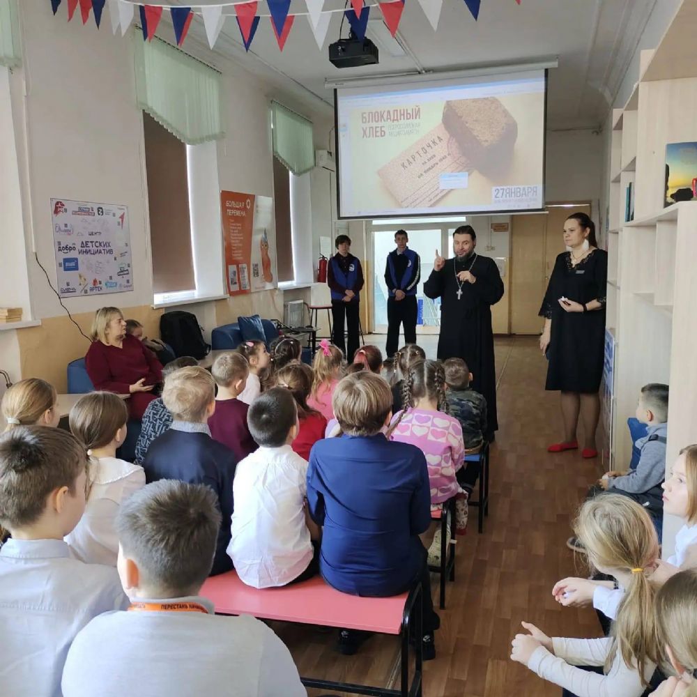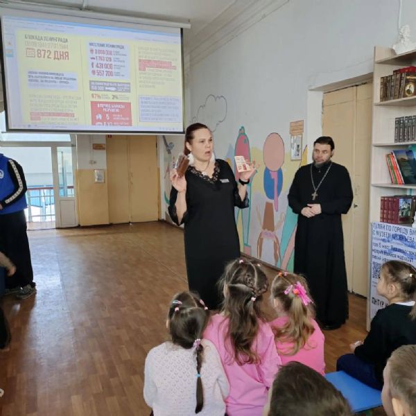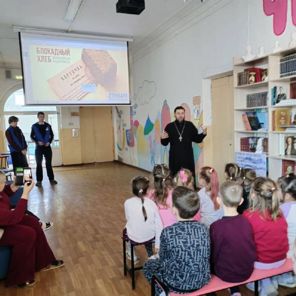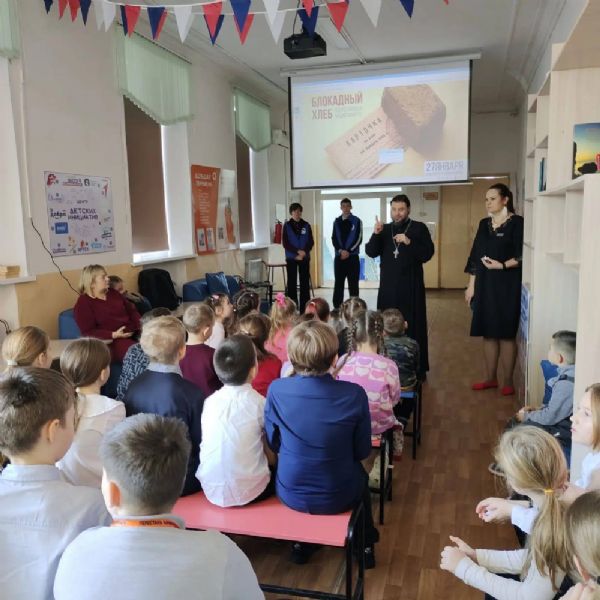 Отец Даниил рассказал детям о событиях Великой Отечественной войны, о подвиге жителей блокадного Ленинграда и о цене Победы. Он подчеркнул важность бережного отношения к хлебу, объяснив, что хлеб — это не просто продукт питания, а символ, имеющий духовное значение.