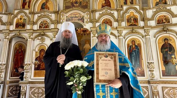 Глава митрополии выразил сердечную благодарность отцу Игорю и вручил ему архиерейскую грамоту за усердные труды во славу Святой Церкви, а также букет белых роз.