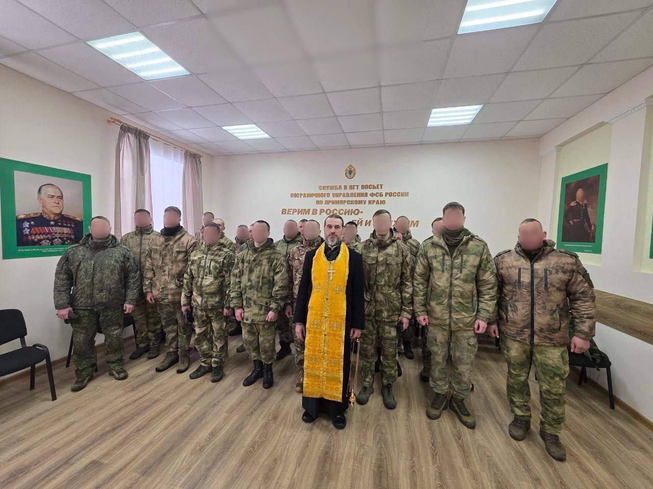 Духовно напутствовал пограничников настоятель храма Иверской иконы Божией Матери п. Зарубино иерей Алексий Синенко. Батюшка совершил чин молебного пения ко Господу Богу о воинах, идущих на брань. По окончании богослужения отец Алексий благословил каждого из воинов и окропил их святой водой.