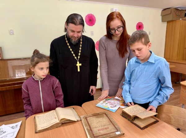 Настоятель храма свт. Николая Чудотворца г. Владивостока в бухте Диомид протоиерей Даниил Нефедьев и директор воскресной школы Марина Нефедьева провели интерактивный урок «Старинные и современные православные книги».