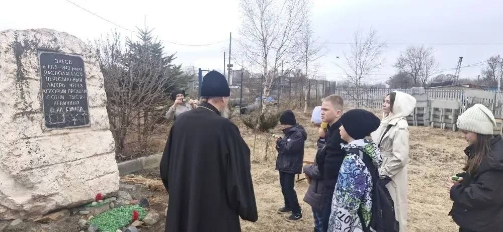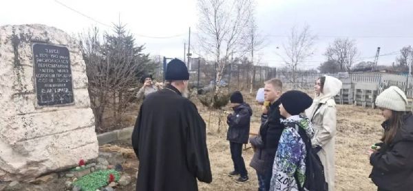 Юнармейцы знают, что на месте современного храма ранее располагался Владивостокский исправительно-трудовой лагерь (Владлаг) — подразделение системы ГУЛАГа. Отец Андрей показал ребятам мемориал, установленный в память о жертвах сталинских репрессий, и рассказал о значении этого места для сохранения исторической памяти.