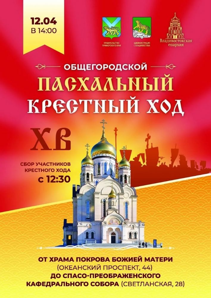 Также сообщаем, что 12 апреля, в праздник Светлой Пасхи, во Владивостоке состоится общегородской крестный ход от храма Покрова Пресвятой Богородицы до Спасо-Преображенского кафедрального собора. Приглашаем всех верующих разделить радость Светлого Христова Воскресения в торжественном молитвенном шествии по центральным улицам города.