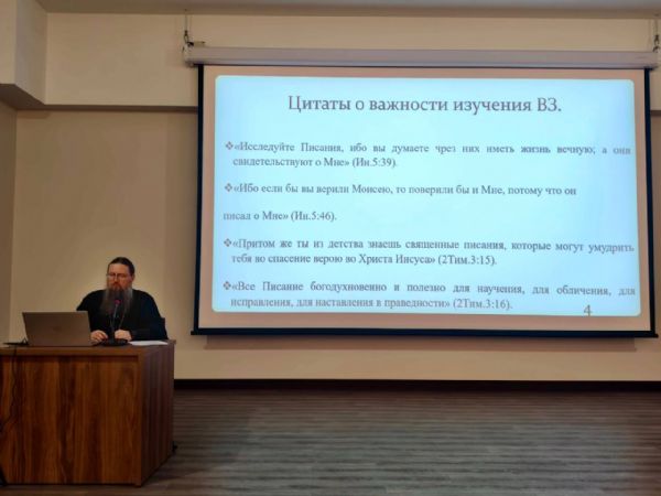 Первый урок провел митрополит Владивостокский и Приморский Павел. Владыка начал с событий, описанных в первых главах Книги Бытия, рассказал о грехопадении и последствиях первородного греха, сопровождая рассказ презентацией на большом экране. В зале присутствовало около 50 человек, но благодаря организованной онлайн-трансляции слушателей было намного больше. Все с интересом слушали архипастыря, многие даже конспектировали.