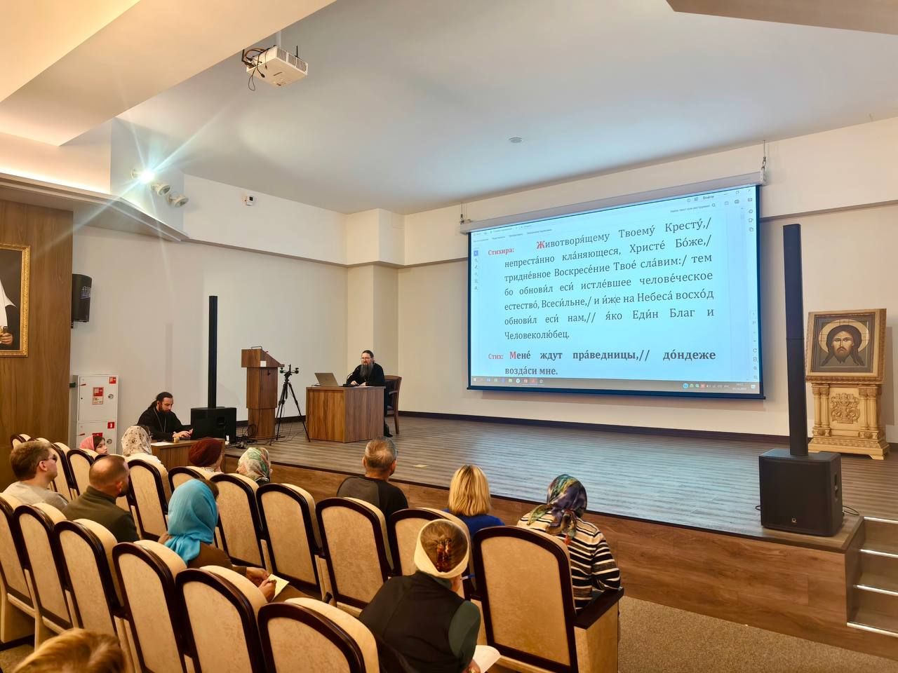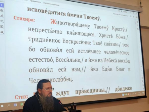 После теоретической части начался урок церковно-славянского языка. Владыка терпеливо и доходчиво объяснял особенности лексики и грамматики, а участники активно переводили на русский язык стихиры предстоящего богослужения.