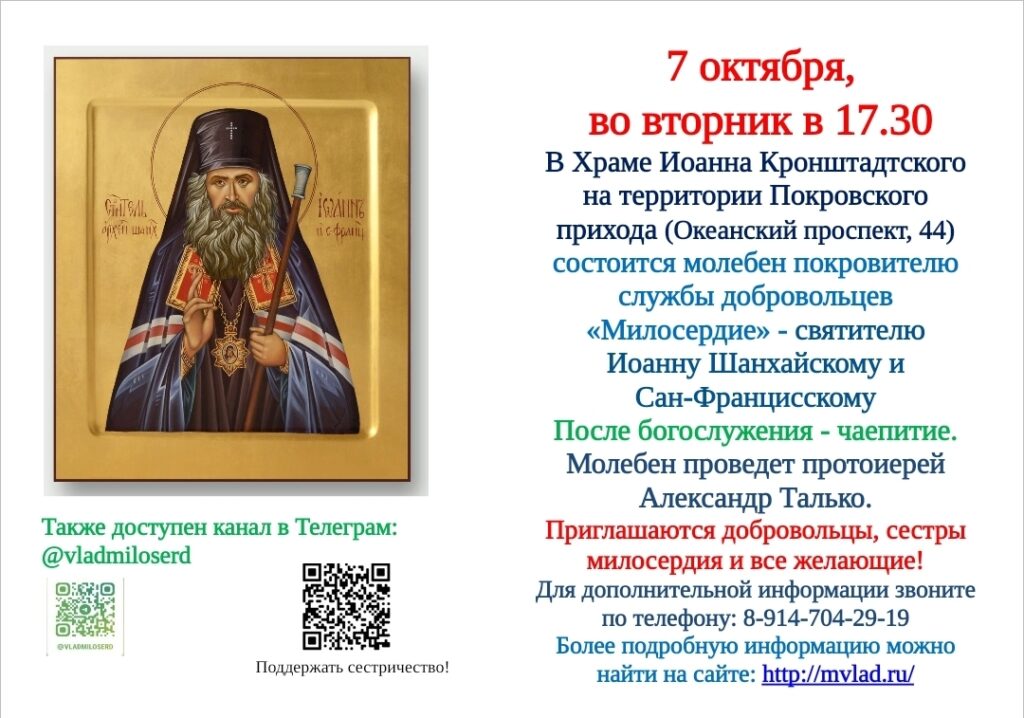 Молебен для добровольцев! 🙏 Когда: 23 сентября (вт) в 17:30 Где:Успенский храм (Светланская, 65, ост. Лазо) Помолимся нашему небесному покровителю — святителю Иоанну Шанхайскому. После — общее чаепитие. Всем, кто хочет присоединиться к делам милосердия или просто помолиться — добро пожаловать! Подробнее: http://mvlad.ru/ Тел:8-914-704-29-19