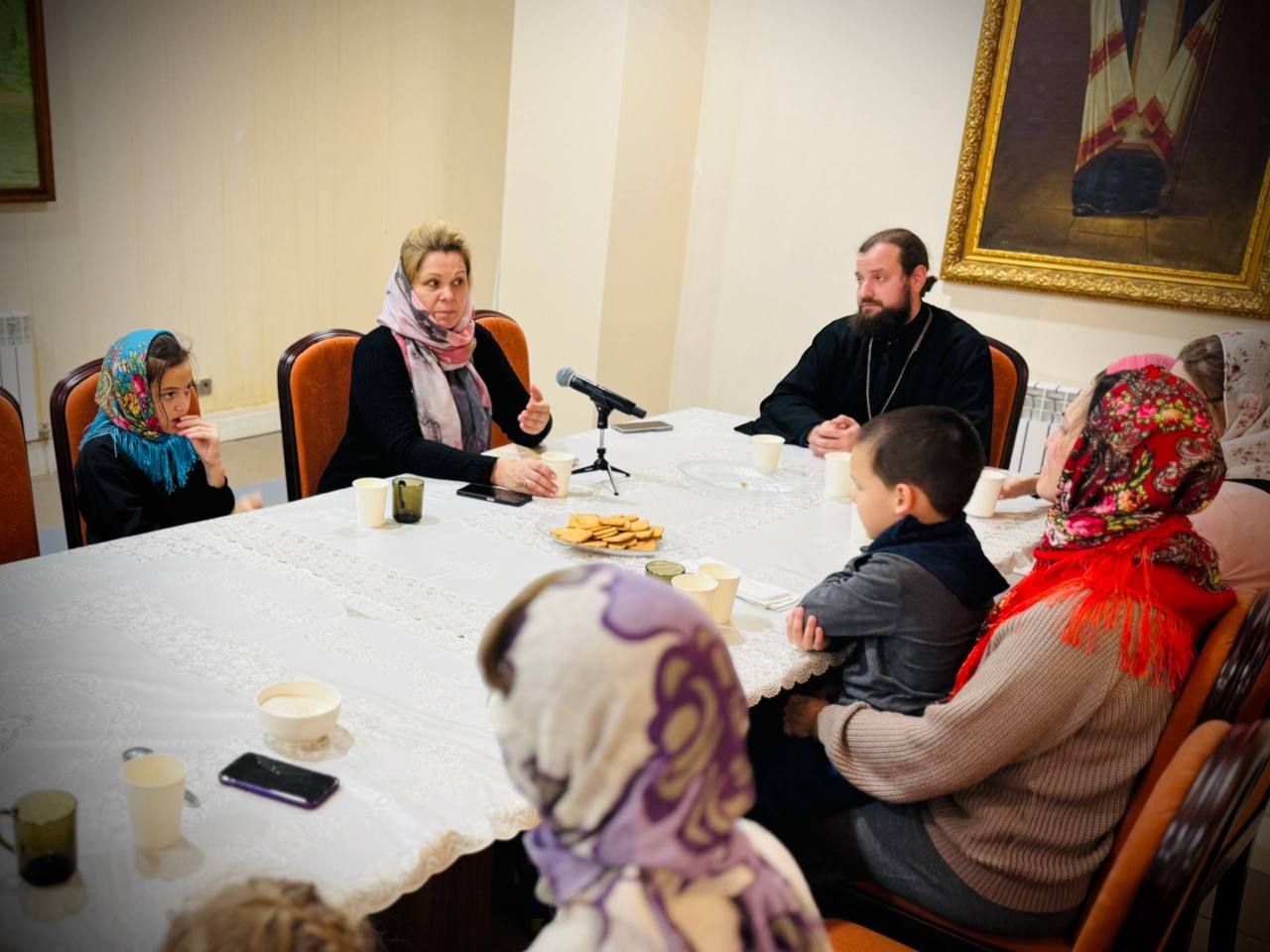 Завершилось мероприятие чаепитием в трапезной и непринуждённой беседой о семье, доме и храме. Дети преподнесли своим мамам их портреты.