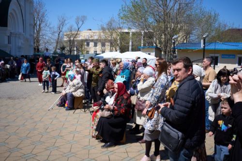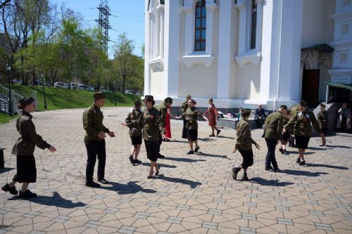 В этом время старшее поколение осталось возле храма петь военные песни