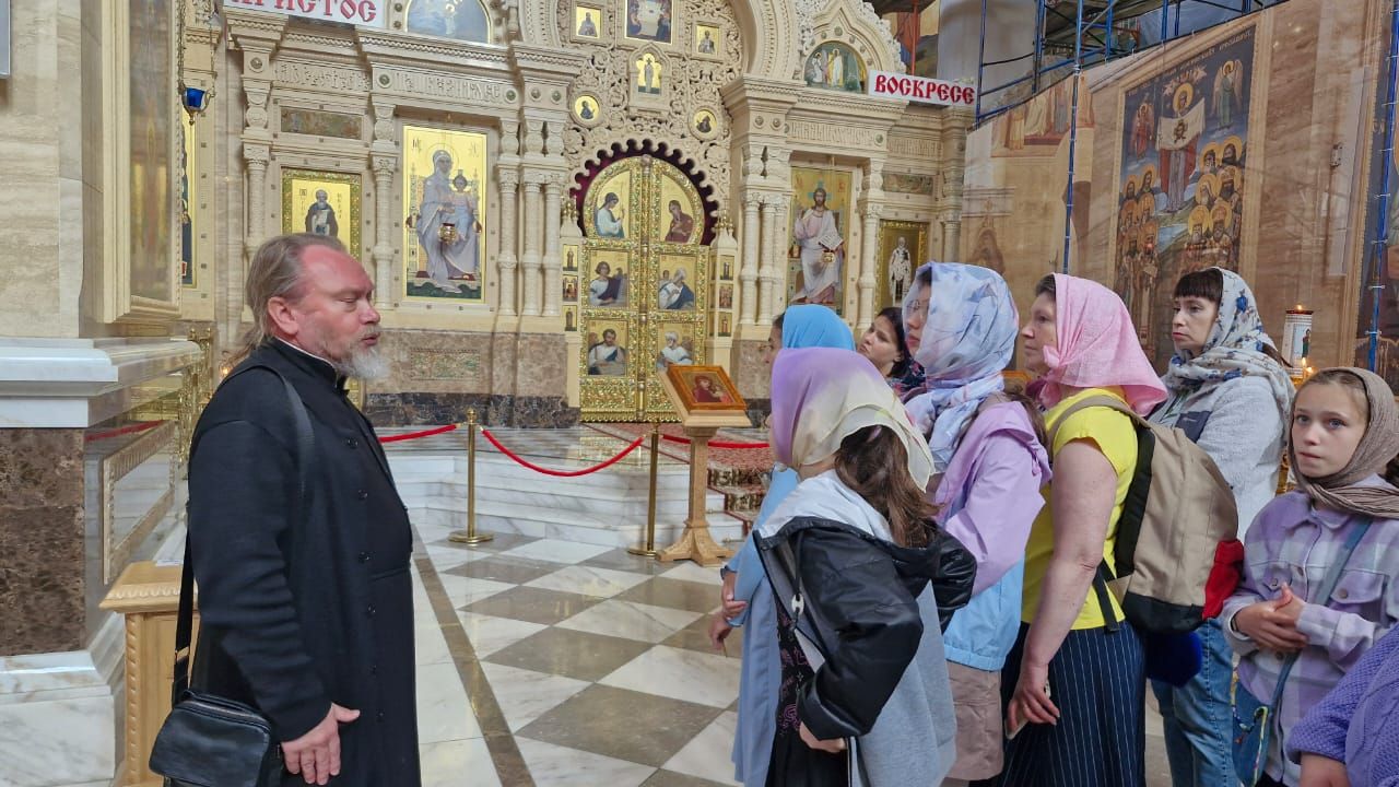 Игумен Антоний (Каменчук) рассказал экскурсантам интересные подробности об истории строительства собора, познакомил детей и взрослых с архитектурой, внутренним убранством и иконами храма, продемонстрировал особенности различных традиций иконописи (древнерусская живопись, «византийская общность», стиль модерн).