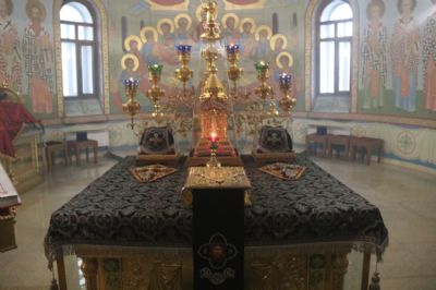 Первая часть службы совершалась в светлых облачениях. После пения великого прокимна и закрытия Царских врат духовенство храма переоблачилось в великопостные черные ризы.