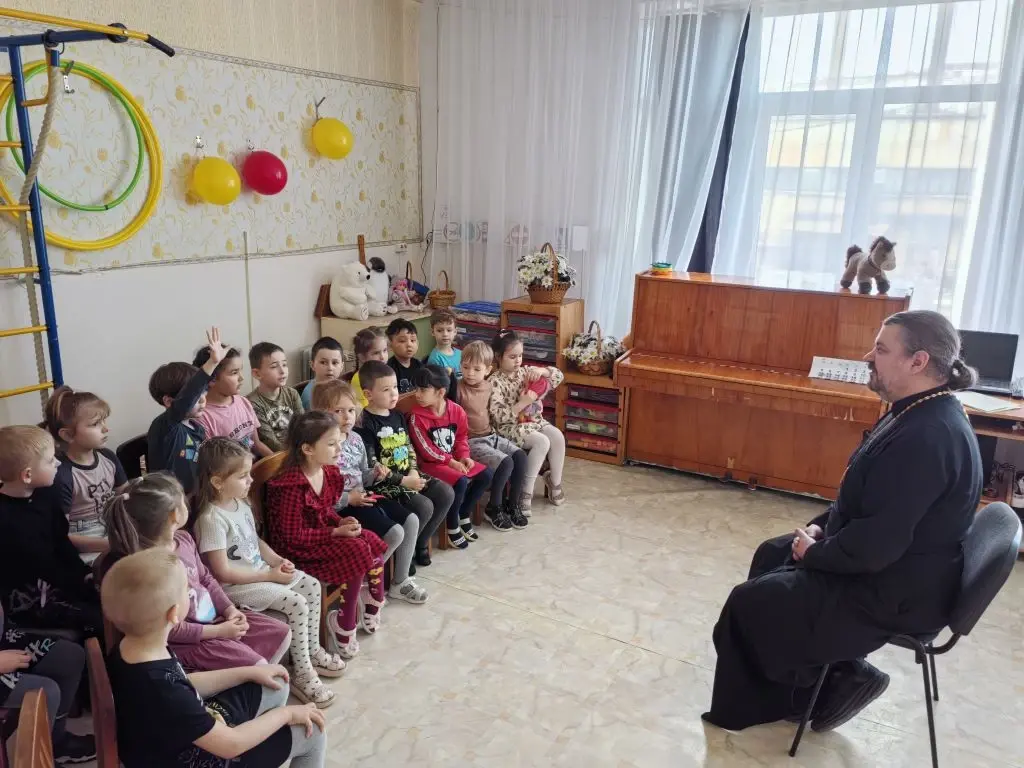 На Светлой седмице иерей Виталий Шаркеев посетил детский сад № 42 г. Находки и побеседовал с воспитанниками детского учреждения о главном христианском празднике — Светлой Пасхе.