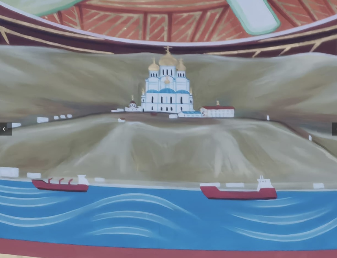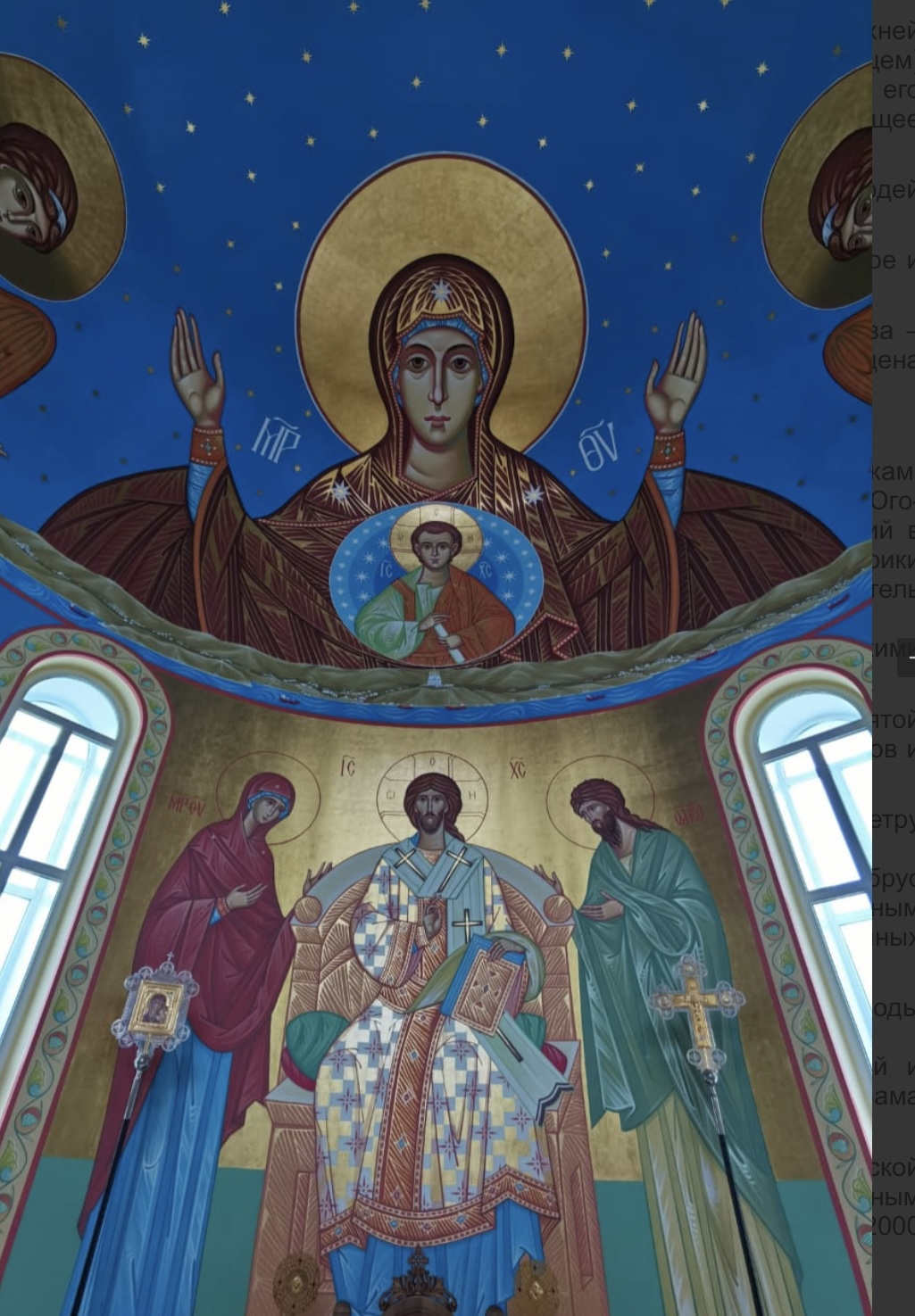 При входе в Храм сразу обращает на себя взор уникальная роспись в верхней части алтарной апсиды – Божья Матерь (Оранта "Молящаяся" с Младенцем) простирает руки над нашим городом Находкой, как бы покрывая его молитвенным жестом, и воспринимается как главное, доминирующее изображение во всем храме.